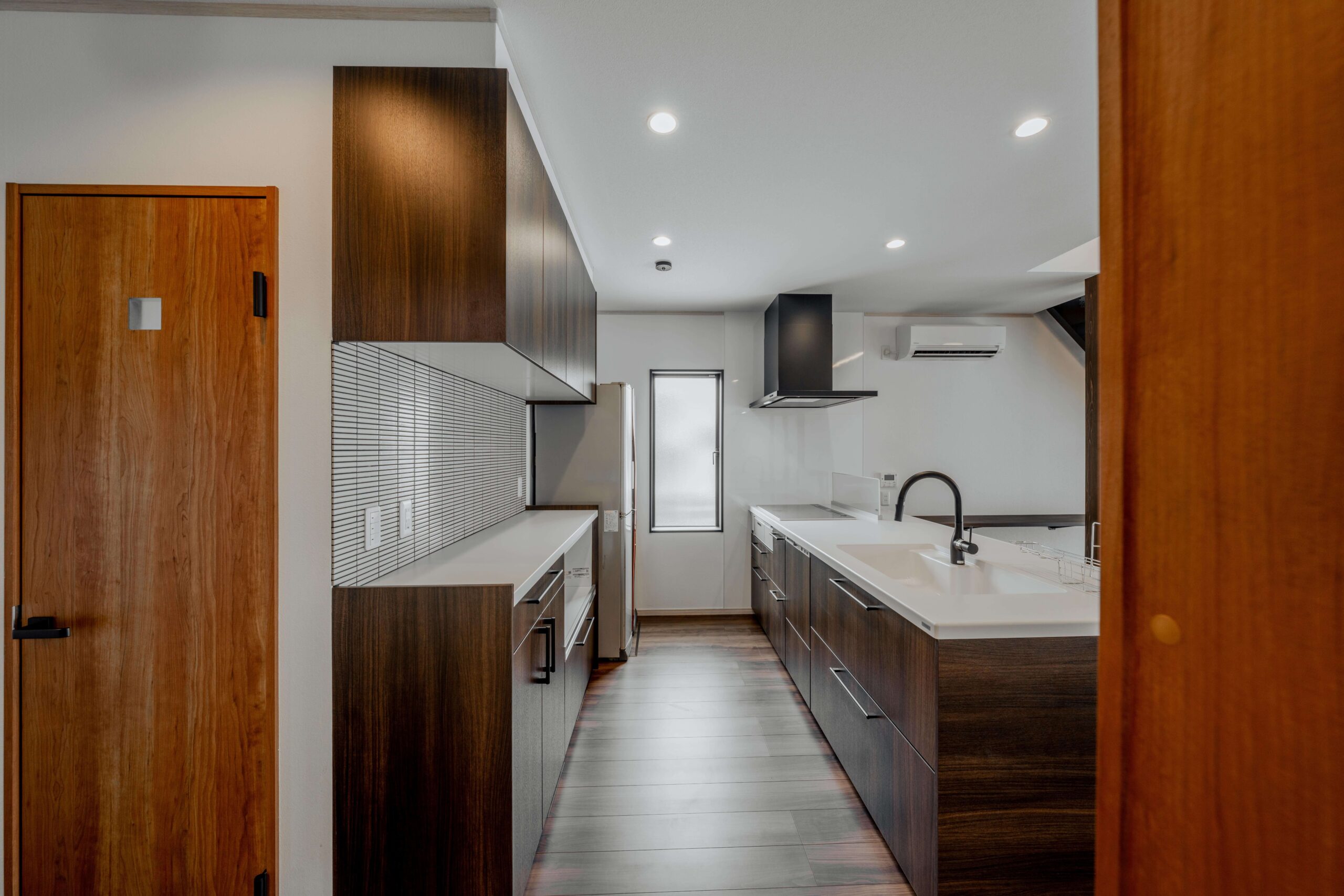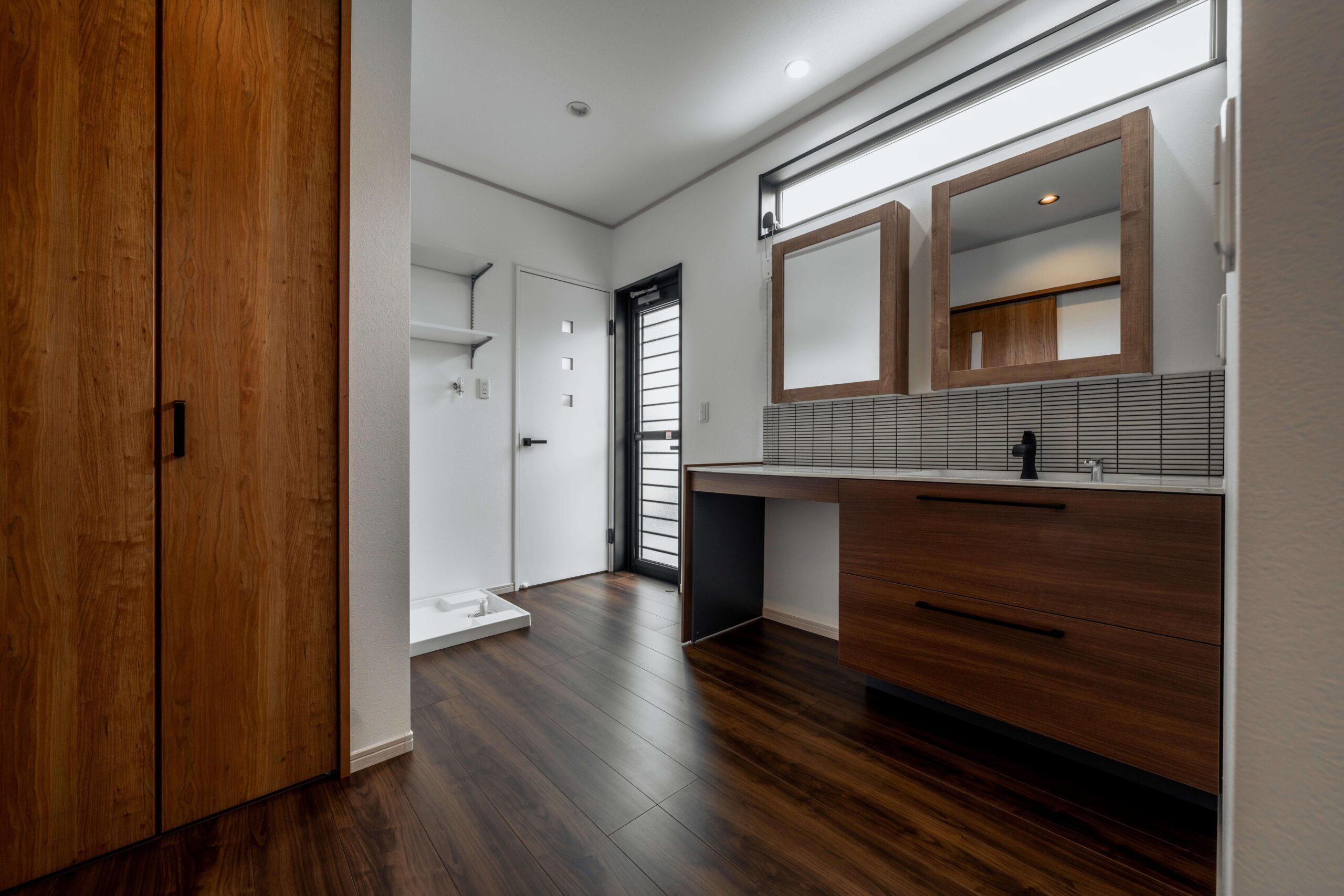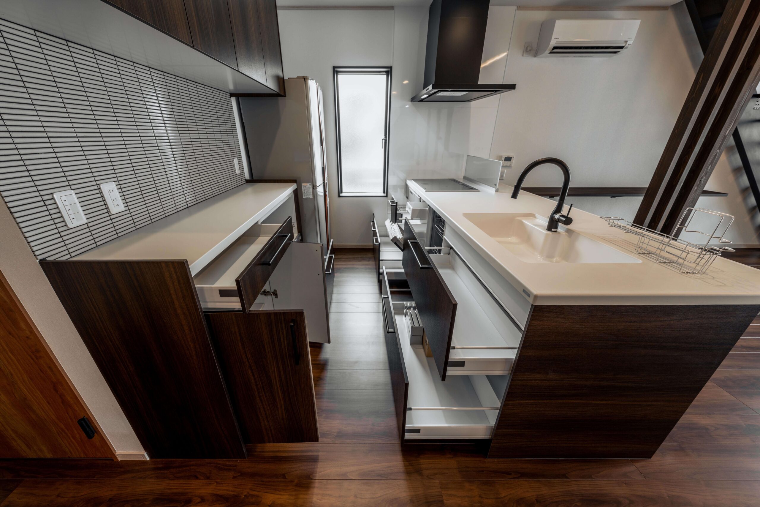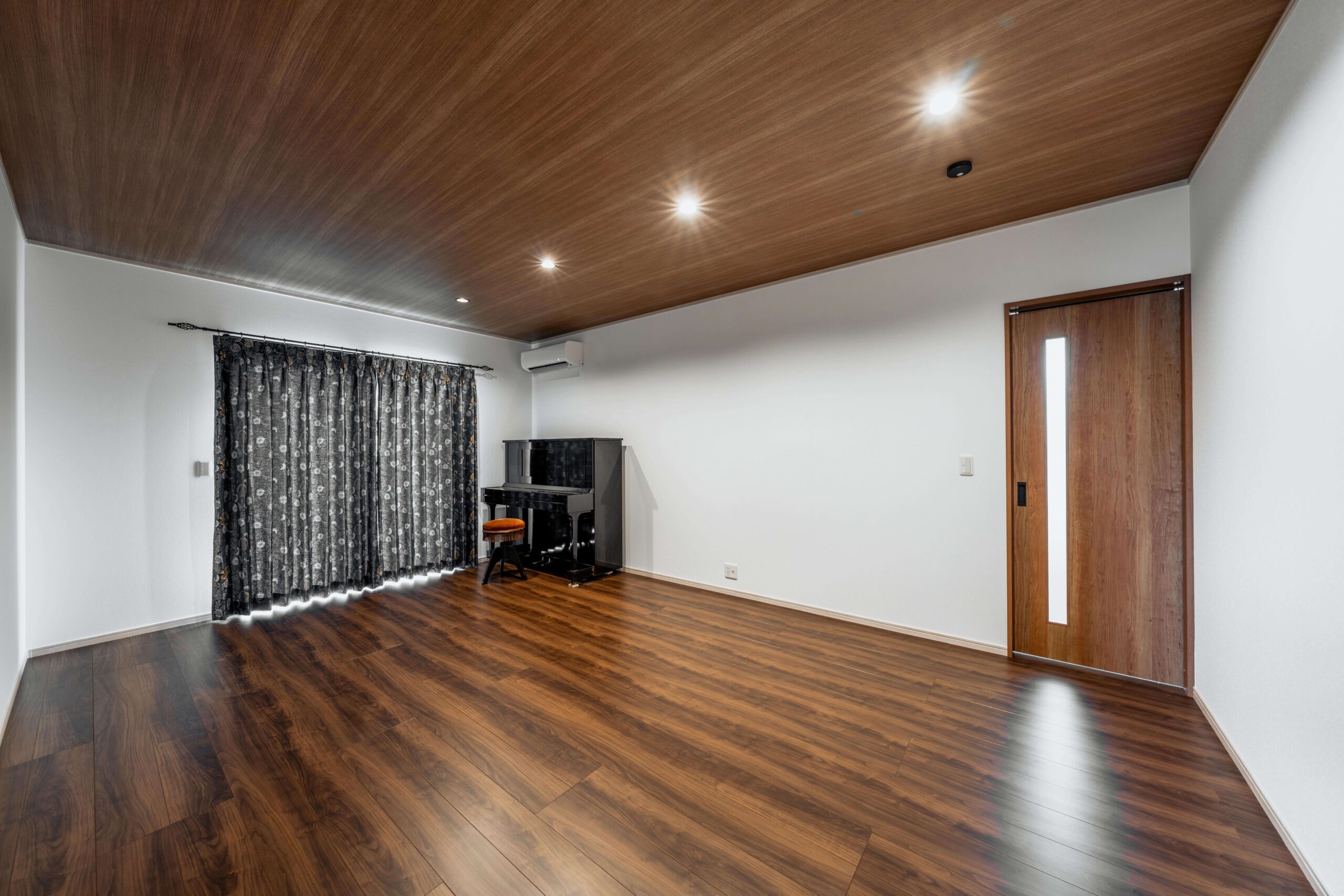引き出しの床下収納設置。板の間には間接照明です。