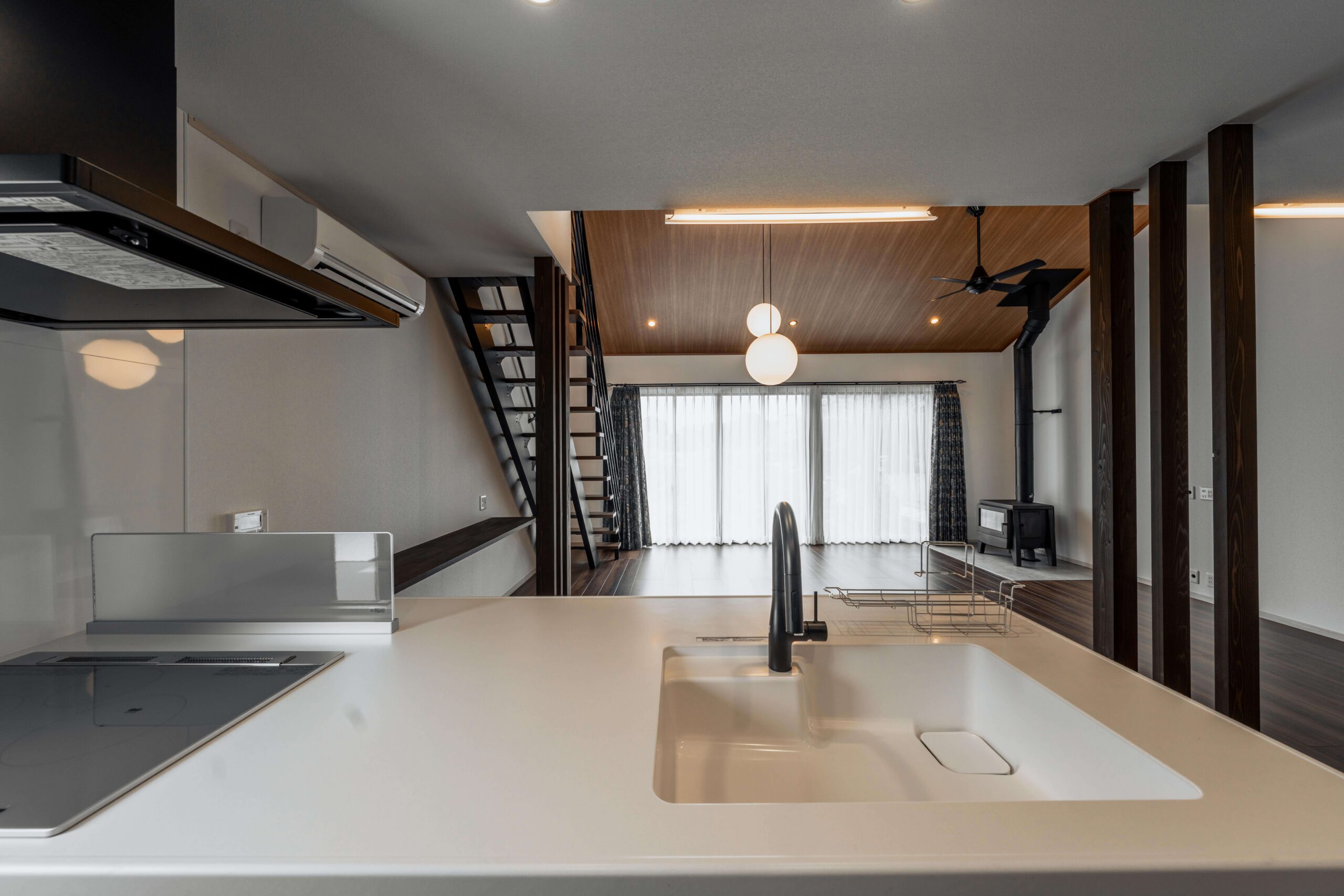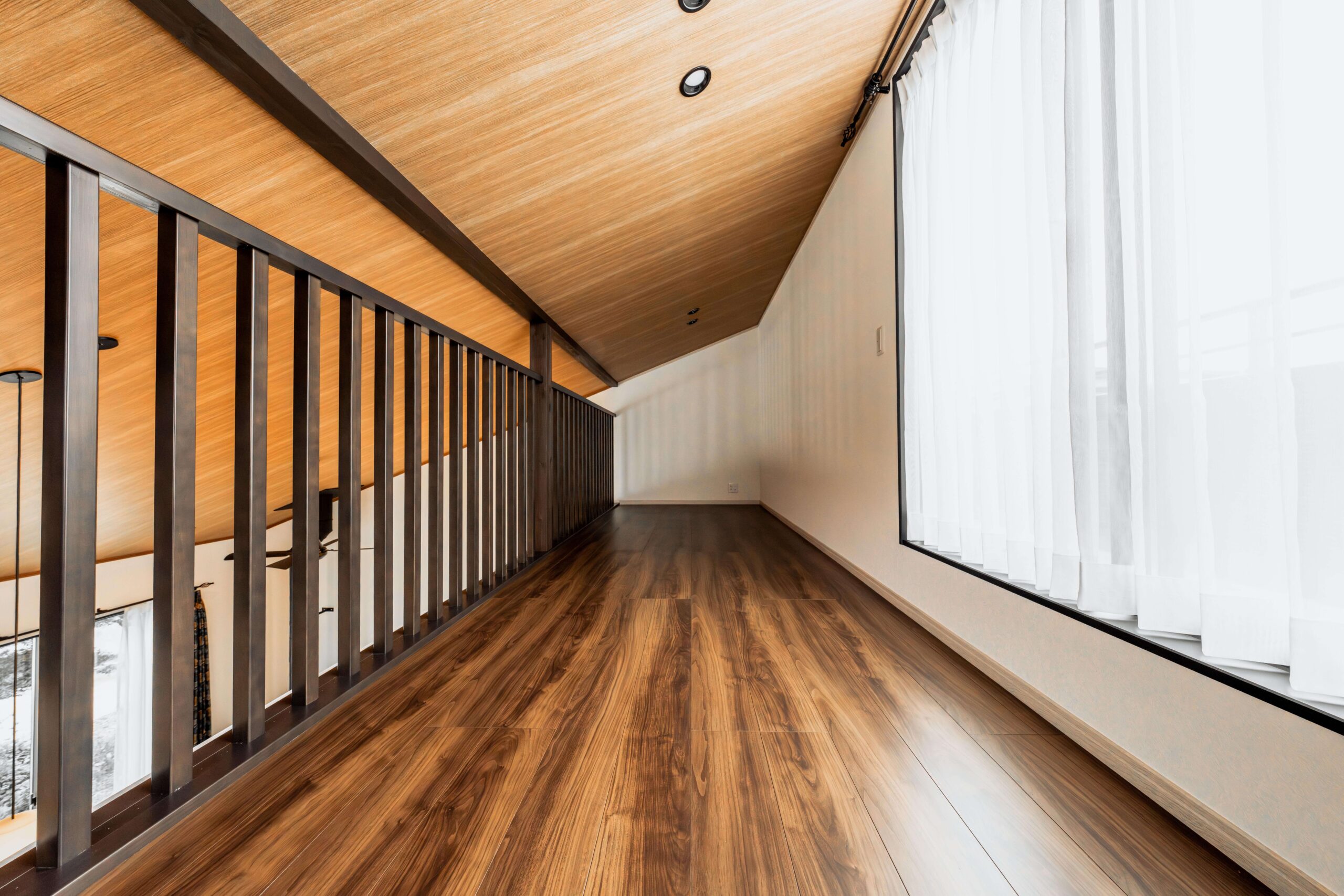 リビングダイニングは勾配天井とし、ロフト、バルコニーにつながっています。